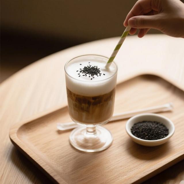在普通冰拿鐵上擠上一層厚厚的黑芝麻奶蓋(黑芝麻醬+奶油 +糖打發),撒上黑芝麻碎,顏值直接封神!用吸管戳破奶蓋的瞬間,治愈感爆棚!